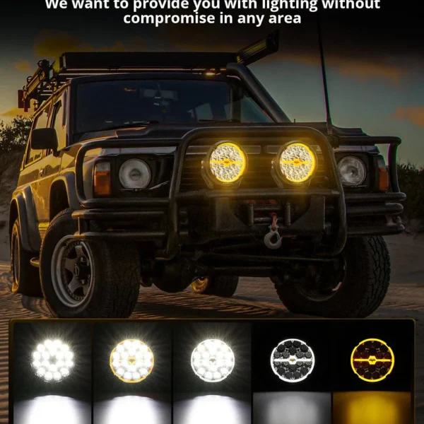 Dual color temperature – 6500K white for clarity and 3000K amber for improved visibility in fog or dust.