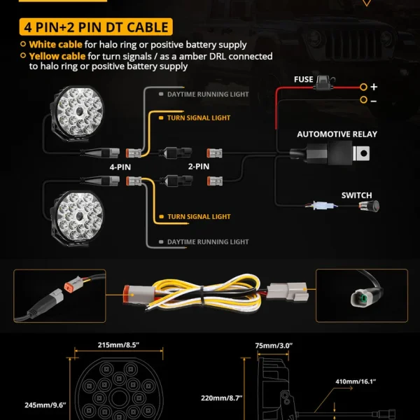 Multi-Function Lighting: Features white driving lights, amber & white DRLs, and amber turn signals for versatile operation.