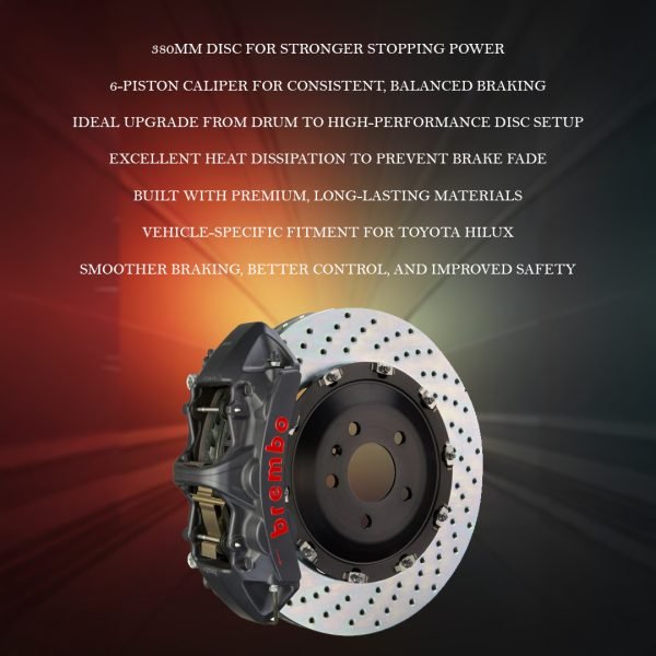 Take your Toyota Hilux’s braking performance to the next level with the Brembo GT-S 380mm 6-Piston Caliper Front Brake Kit. As part of Bremboโ€™s premium GT-S series, this high-performance brake kit is engineered for exceptional stopping power, precision, and control. Whether youโ€™re tackling rugged terrain, heavy loads, or high-speed driving, this upgrade ensures superior braking efficiency and enhanced safety.