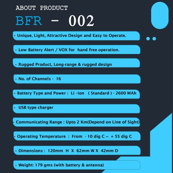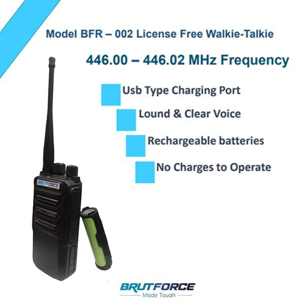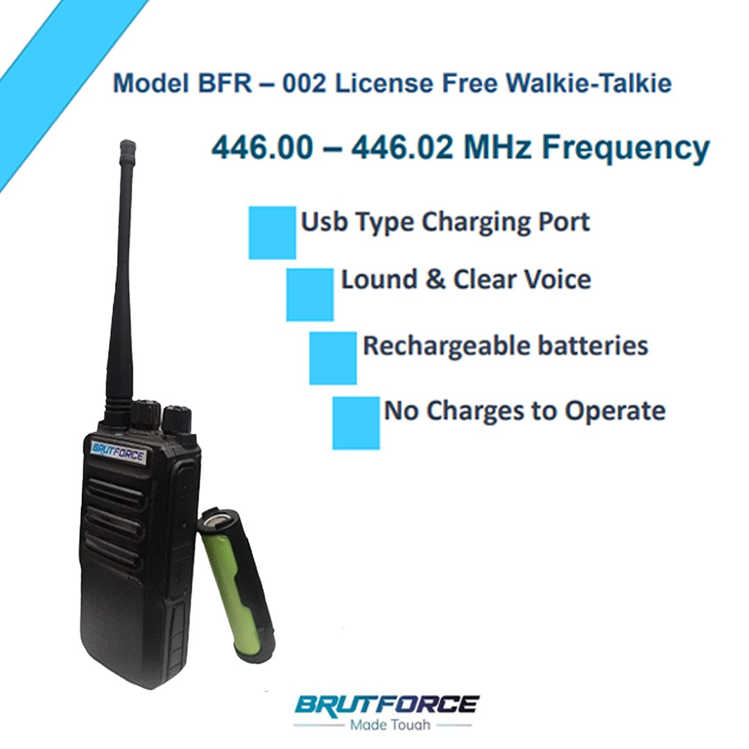 The License Free Walkie Talkie BFR-002 is designed for reliable, hassle-free communication in demanding environments. Operating on the PMR 446 frequency band, it eliminates licensing requirements while delivering clear voice transmission, durable build quality, and dependable range for everyday professional and outdoor use.