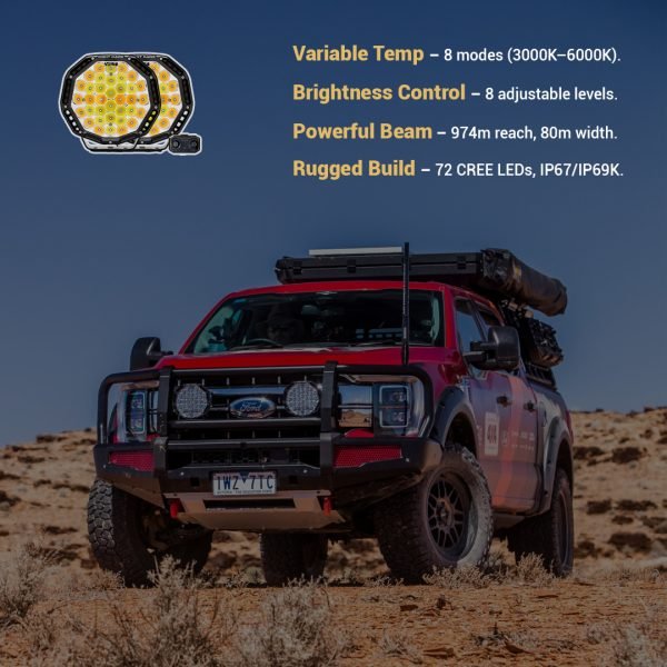 The Bushranger NightHawk VCT 9″ Driving Light Kit delivers premium lighting performance and unmatched versatility for serious drivers and off-road enthusiasts. Featuring variable colour temperature and adjustable brightness, it lets you customise your lighting to suit any terrain or weather. Designed and engineered in Australia, this kit is built with high-performance CREE LEDs for long-lasting durability in the harshest conditions.
