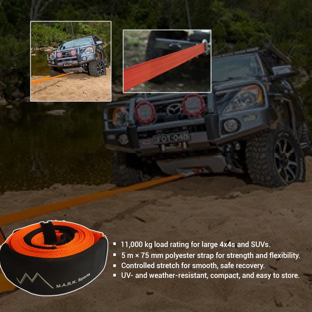 Tackle tough recovery situations with confidence using the M.A.R.K. SPORTS Snatch Strap 11000Kg, engineered for heavy-duty off-road use. Designed for SUVs, 4x4s, and pickup trucks, this recovery strap delivers exceptional strength and elasticity, allowing smooth, controlled recoveries from mud, sand, or rough terrain. Made from 100% high-grade polyester, it’s built to handle extreme loads while ensuring safety and durability.