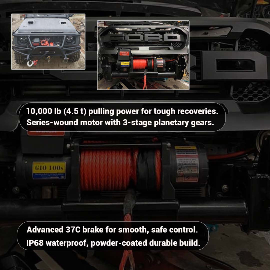 The ComeUp GIO 100s Winch offers 10,000lb (4.5T) pulling capacity, IP68 waterproof rating, synthetic rope, and durable 12V power for 4×4 recovery.