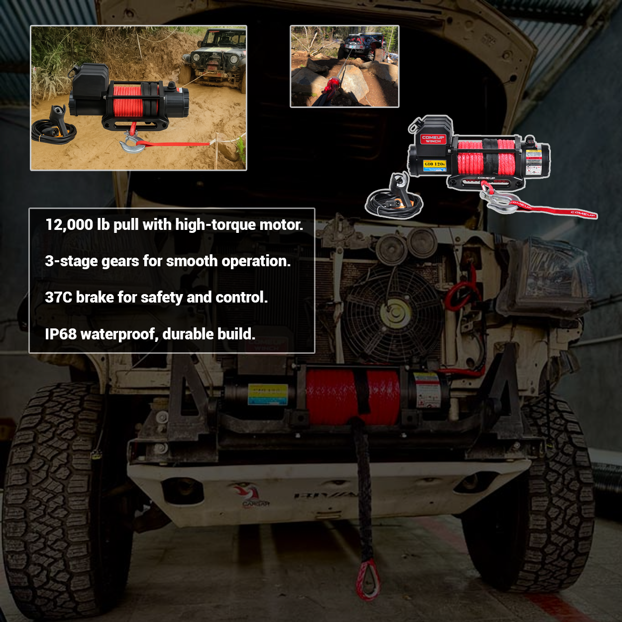 The ComeUp GIO 120s Winch is engineered for serious off-road enthusiasts seeking power, performance, and reliability. Featuring a 12,000 lb (5,443 kg) single-line pull and a 6.5 HP 12V series-wound motor, it’s designed to handle tough recoveries with ease. Equipped with a synthetic rope, IP68 waterproof construction, and three-stage planetary gear system, the GIO 120s ensures smooth, efficient, and safe recovery even in the harshest terrains.