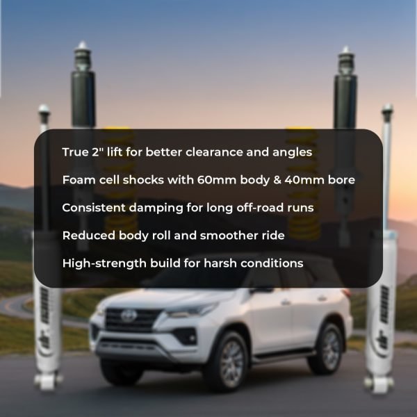 Upgrade your Toyota Fortuner’s suspension with the Dr. Nano 2-Inch Lift Kit and conquer any terrain with confidence, comfort, and control.