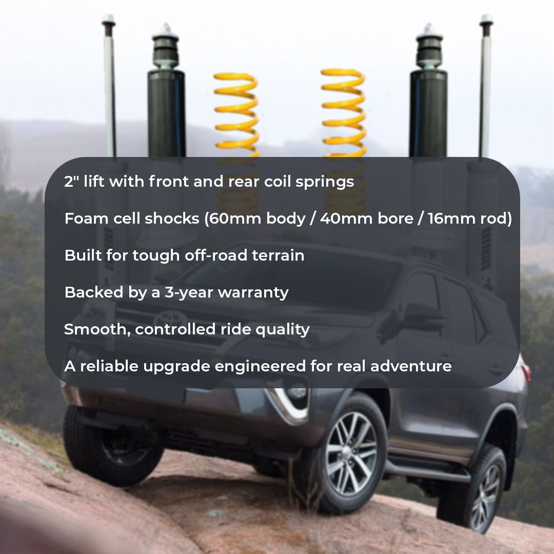 Upgrade your Toyota Fortuner with the Dr. Nano 2-Inch Lift Kit, designed to enhance ground clearance, off-road capability, and ride comfort. Featuring high-quality Foam Cell Shock Absorbers and precision-engineered coil springs, this kit ensures durability, stability, and superior damping performance for any terrain.