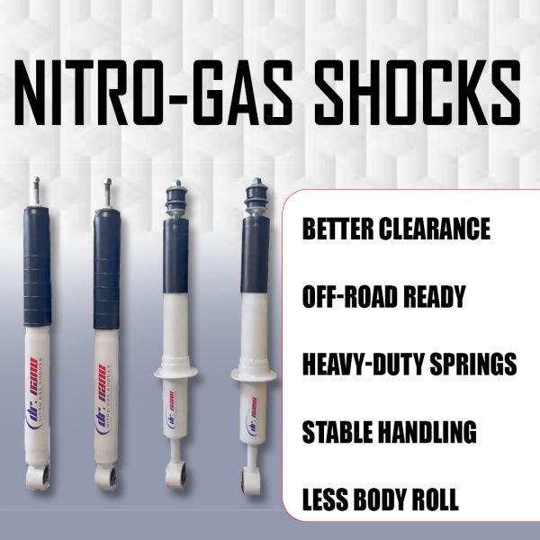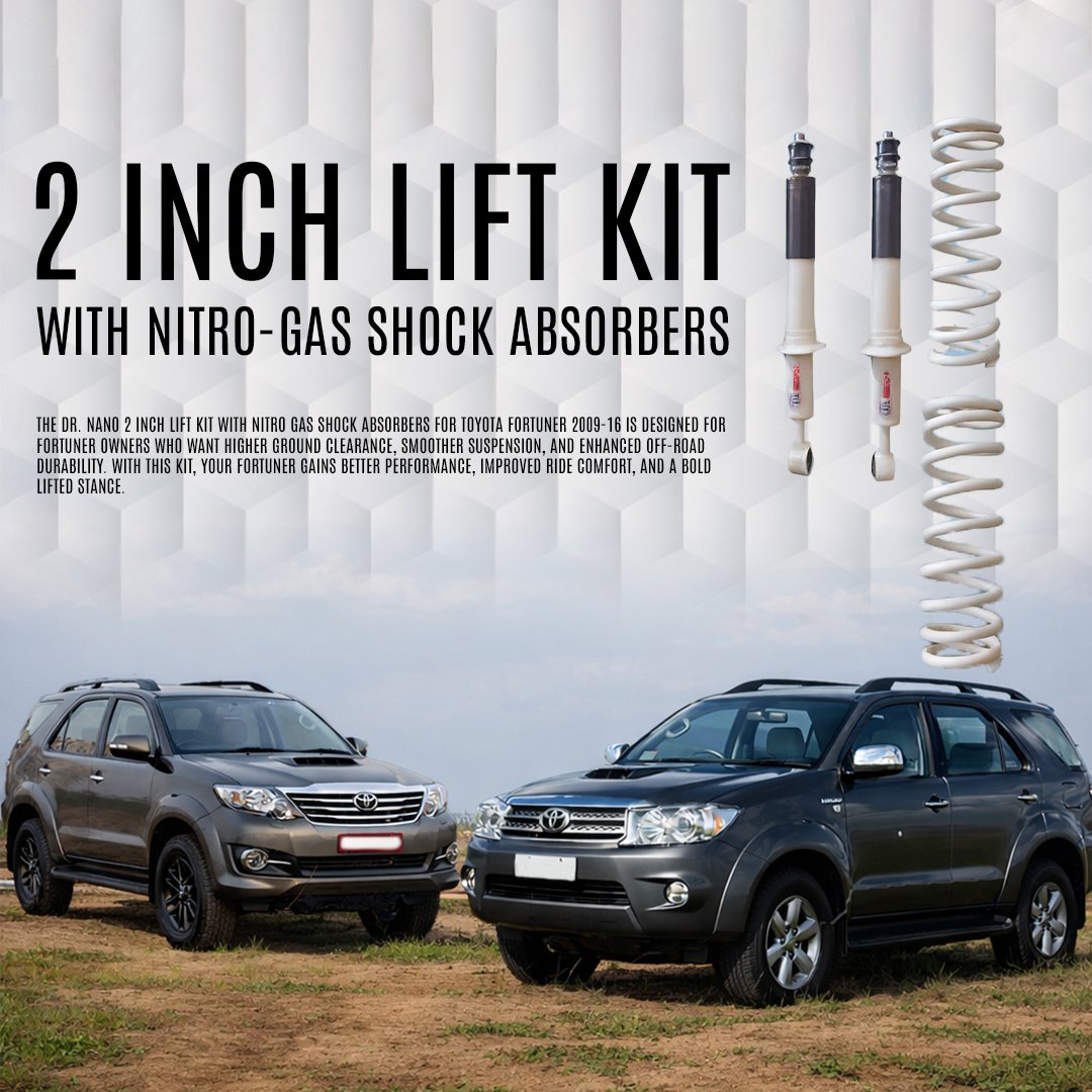 The Dr. Nano 2 Inch Lift Kit with Nitro Gas Shock Absorbers for Toyota Fortuner 2009-16 is designed for Fortuner owners who want higher ground clearance, smoother suspension, and enhanced off-road durability. With this kit, your Fortuner gains better performance, improved ride comfort, and a bold lifted stance.