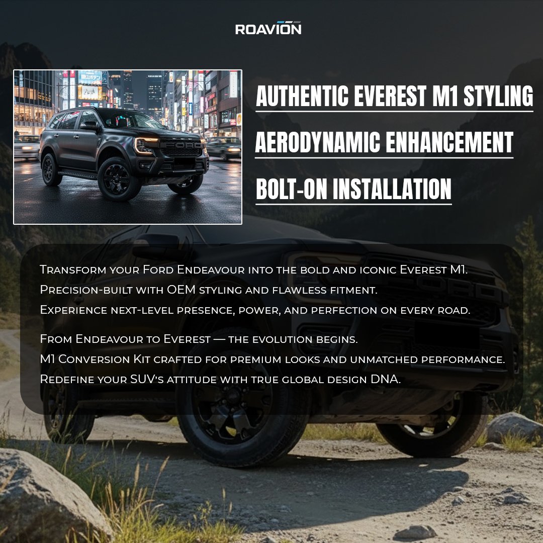 Elevate your Ford Endeavour’s presence with the M1 Conversion Kit —a full-body upgrade that mirrors the aggressive, premium design of the 2023 Ford Everest Ranger Raptor. Designed with precision, this kit is the perfect solution for enthusiasts looking to blend rugged performance aesthetics with factory-level integration.