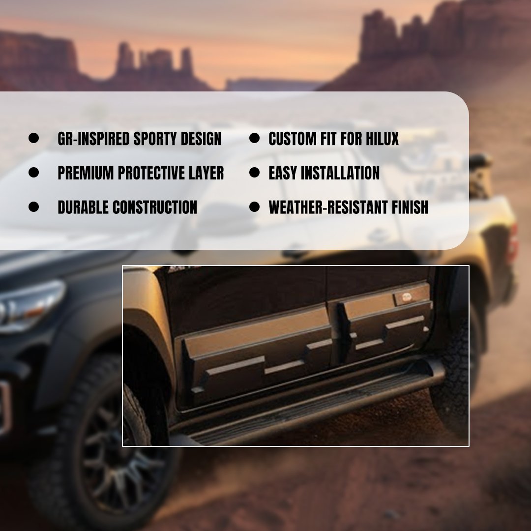 Enhance both style and protection with the GR Door Cladding. Order now to give your Toyota Hilux the rugged, race-ready look it deserves!