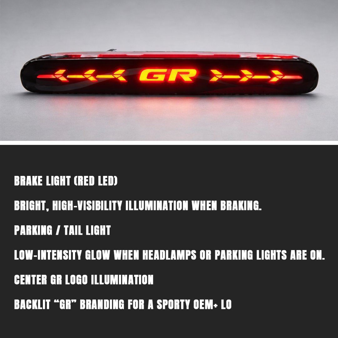 Enhance rear visibility and sporty styling with the Hilux GR Tailgate Light, designed to deliver high-visibility braking illumination and a bold GR identity. Perfectly suited for Hilux GR builds, this LED tailgate light adds both functional safety and premium OEM-inspired aesthetics to your pickup.