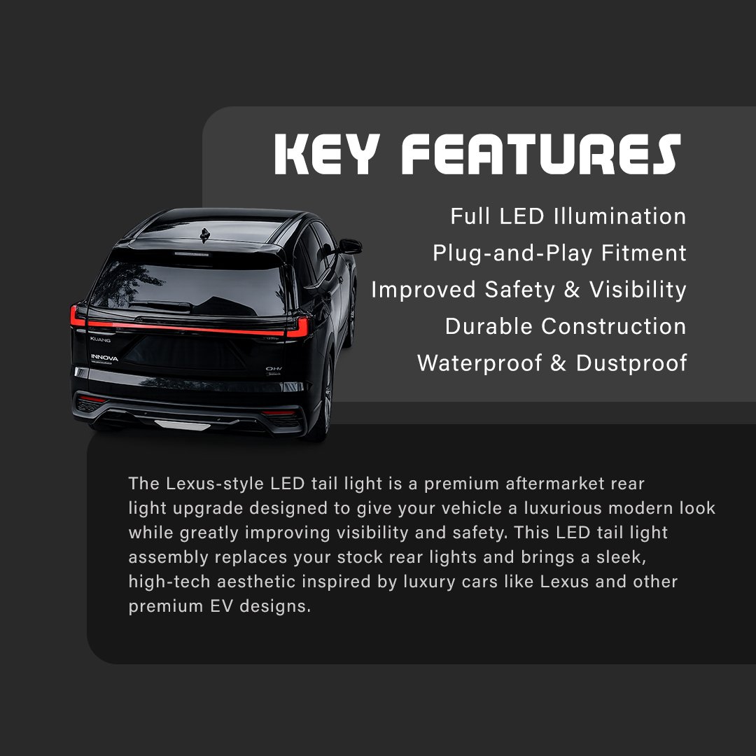 The Hycross Lexus Style Tail Light is a premium upgrade designed to transform the rear profile of your vehicle with a sleek, modern, and luxurious appearance. Inspired by high-end Lexus designs, this full LED setup delivers a connected light bar effect that enhances both style and visibility.