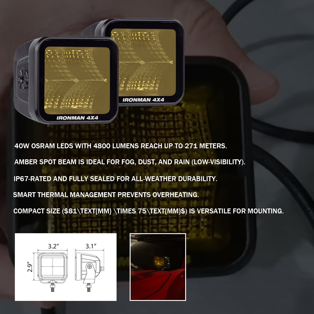 Add the Ironman 4×4 40W Bright Amber Spot Beam Cube Light to your setup for unmatched visibility, compact strength, and battle-tested durability—on the trail or at the job site.