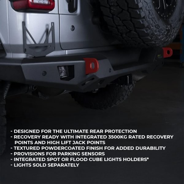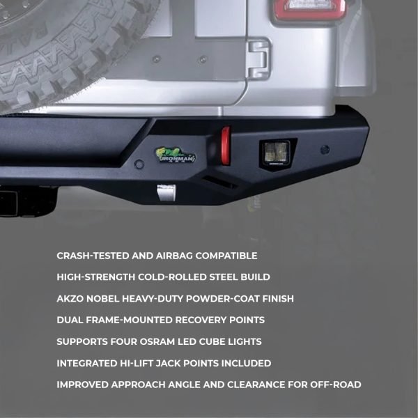 The Ironman 4×4 Raid Rear Bumper Kit is engineered to enhance the safety, functionality, and aesthetics of your Jeep Wrangler JL or JLU (2018–2024 models). It is the first of its kind to be fully crash safety tested and SRS airbag compatible, ensuring maximum protection both on and off the road.