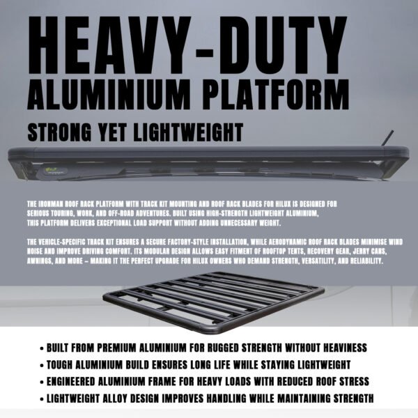Perfect for camping, off-roading, and work-related hauling, the Ironman 4×4 Roof Rack Platform with Track Kit & Blades is a must-have upgrade for your Toyota Hilux. 🚙🔧