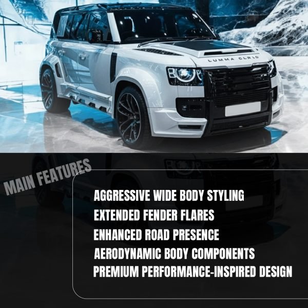 Upgrade your SUV’s road presence with the Lumma Wide Body Kit for Land Rover Defender 110 — a masterpiece of craftsmanship and performance-inspired styling. Designed by Lumma Design, this wide body kit transforms the Defender 110 into an unmistakable statement of power, elegance, and exclusivity. Crafted with precision using premium materials, each component enhances aerodynamics while maintaining the Defender’s rugged DNA.