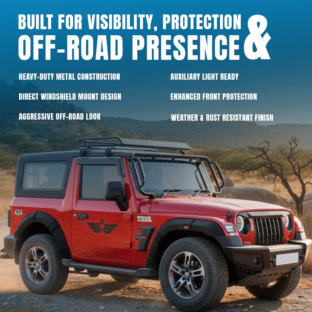 Enhance your Mahindra Tharโs look and functionality with the M-TEK Wind Screen Bar, designed for rugged durability and a bold appearance. Crafted with precision engineering, this bar withstands harsh conditions while adding a sophisticated touch to your vehicleโs front profile.