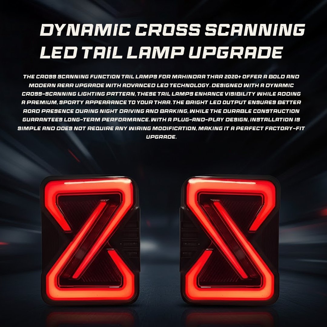 Upgrade your Mahindra Thar 2020+ with Cross Scanning Function Tail Lamps, designed for enhanced style and safety. These advanced LED tail lamps offer superior visibility and durability, making them a must-have upgrade for your vehicle.