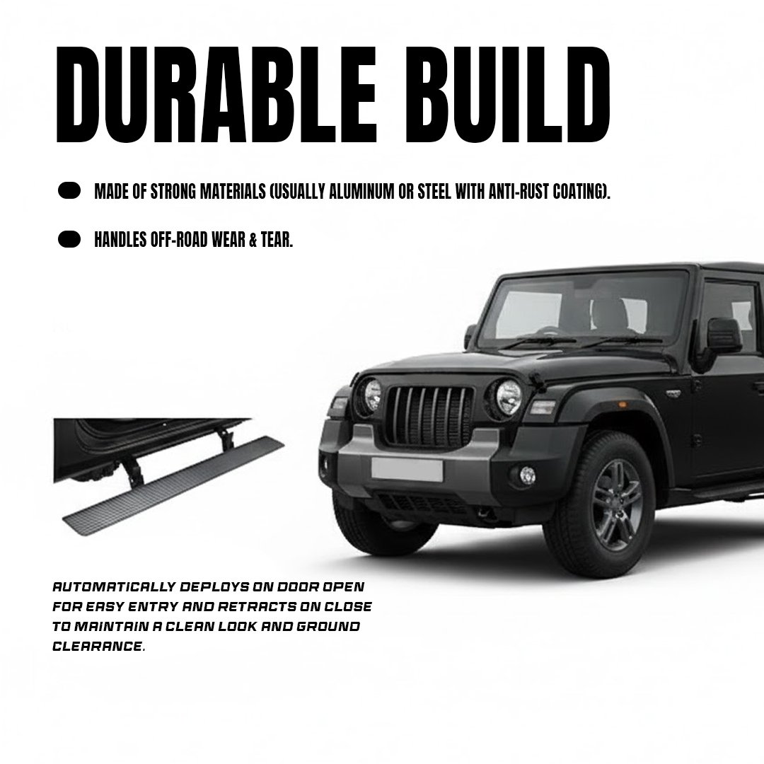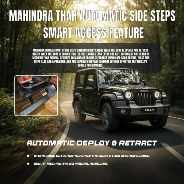 Upgrade your SUV with Mahindra Thar Automatic Side Steps, engineered to provide effortless entry and exit while maintaining the iconic stance and ground clearance of the Thar. Designed for practicality and premium comfort, these automatic deployable footboards extend when the doors open and retract neatly once closed, making them an ideal accessory for lifted or stock-height Thar models. Whether used daily or for off-road adventures, they enhance accessibility without compromising performance or rugged visual appeal.