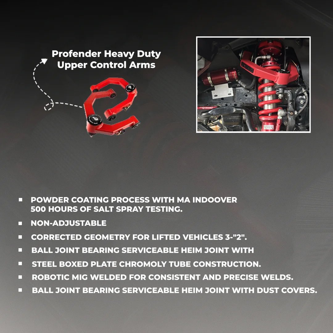 Heavy-Duty Upper Control Arms – Corrected geometry for lifted vehicles (3–2 inches) ensuring proper alignment and stability.