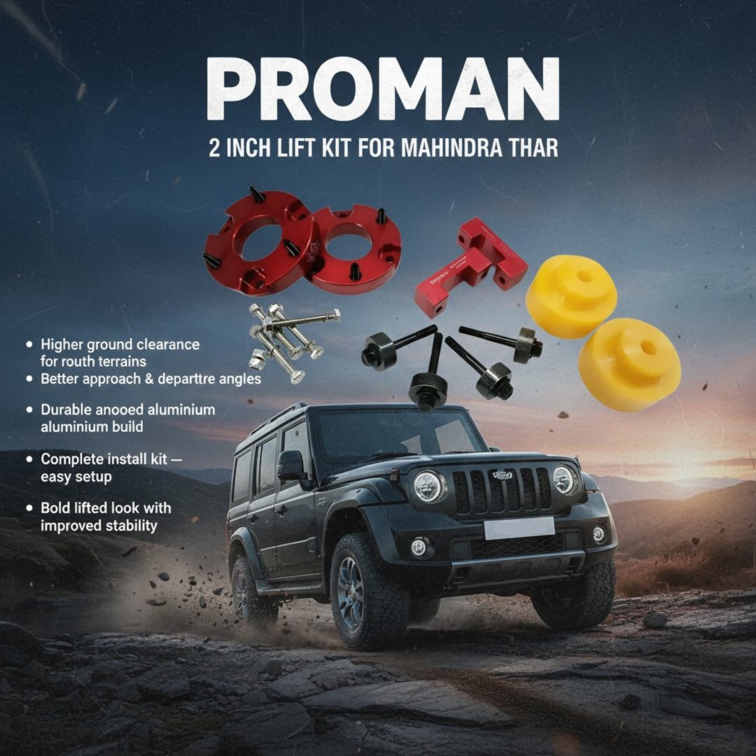 Upgrade your Mahindra Thar with the Proman 2-Inch Lift Kit, engineered to provide superior ground clearance and enhanced off-road performance. Whether you’re navigating rocky trails, sandy dunes, or rugged landscapes, this lift kit ensures your Thar is built for the challenge.