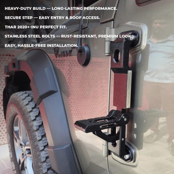 Enhance the accessibility and functionality of your Mahindra Thar (2020+) with the Proman Door Step Hinge Set. Designed for effortless entry, easy roof access, and added convenience, these heavy-duty hinges provide a sturdy foothold whether you’re loading gear, cleaning the roof, or stepping in and out of your vehicle. Ideal for both off-road adventurers and daily drivers, this hinge set is a must-have upgrade for your Thar.