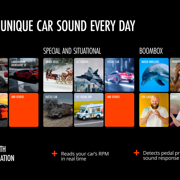 - Versatile Sound Library: Choose from over 25 legendary sports car sounds (e.g., Porsche 911 Turbo S, BMW M3, Lamborghini Aventador SV) or futuristic tones like “UFO” and “Transformer.”