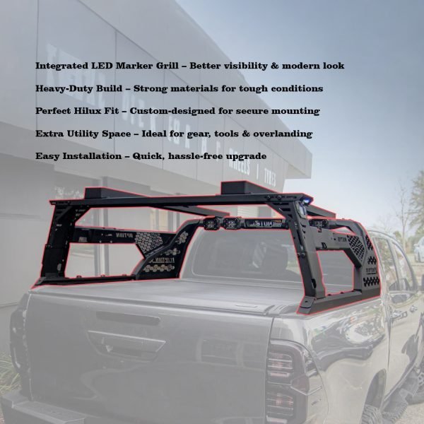 Unlock the full potential of your Toyota Hilux with the Option X Bed Rack System, a premium upgrade that blends rugged durability with modern design. Featuring an integrated grill with marker LEDs, this system enhances visibility while adding a sleek, aggressive look to your Hilux. Whether you’re hauling gear for an off-road adventure or navigating city streets, this versatile bed rack offers unmatched functionality and style.