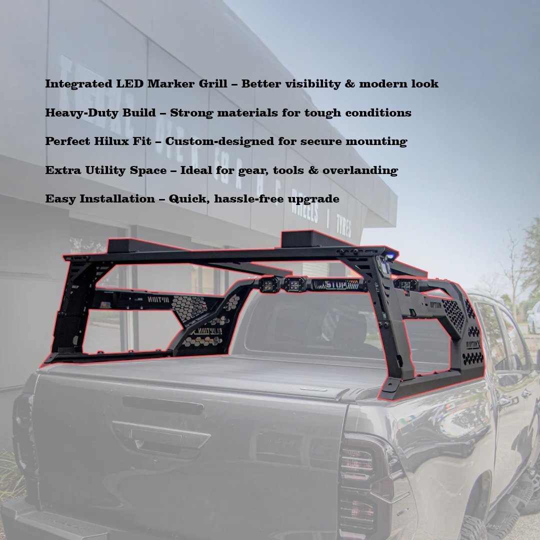 Maximize the potential of your Toyota Hilux with our Bed Rack System Option X. Our integrated Grill with Marker LEDs is designed to increase visibility,lend your Hilux a modern aesthetic