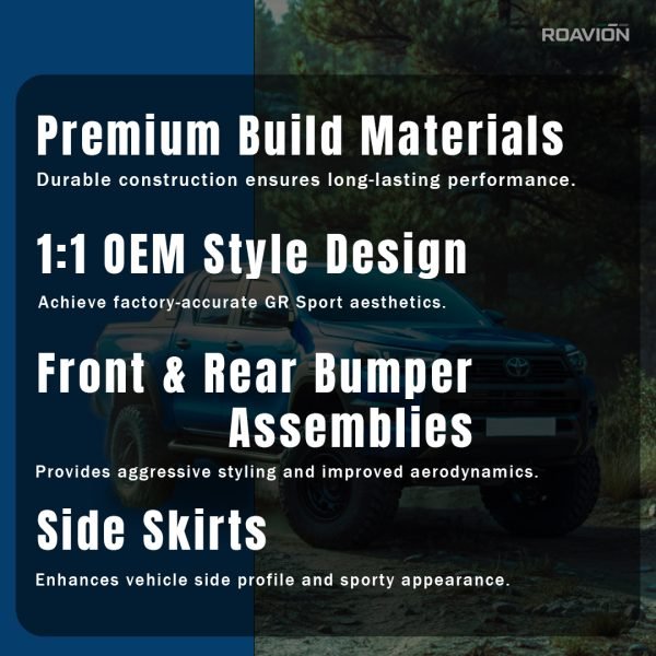 Upgrade the look of your Toyota Hilux with Revo To Rocco body kit with this complete conversion body kit. Designed for a direct fit, this high-quality kit transforms your vehicle’s exterior with enhanced styling, giving it a premium and bold Rocco appearance without the need to buy a new model.