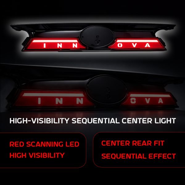 The Toyota Innova Crysta rear scanning center light is designed to enhance both safety and styling by adding a sharp sequential LED effect at the rear of your vehicle. Available in smoked and red finishes, this center-mounted light delivers high visibility during braking while giving the tailgate a premium, modern appearance that stands out in traffic.