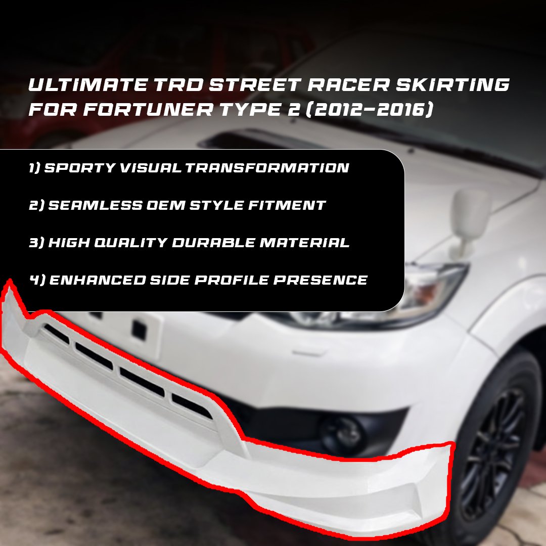 Give your Toyota Fortuner a sharper, more aggressive road presence with the TRD Skirting Kit For Fortuner Type 2 (2012–2016). Designed to transform the lower body profile without compromising OEM fitment, this kit delivers a sportier stance inspired by the iconic TRD styling. Whether you’re aiming for a street-racer look or a premium SUV appearance, this skirting kit ensures your Fortuner stands apart from stock models with a performance-oriented design that complements its muscular build.