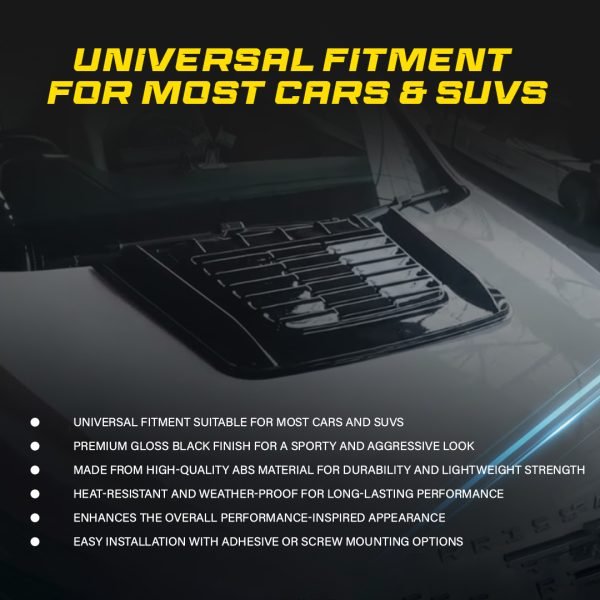 Universal Bonnet Scoop Gloss Black enhances sporty styling while adding a bold performance-inspired look to cars and SUVs.